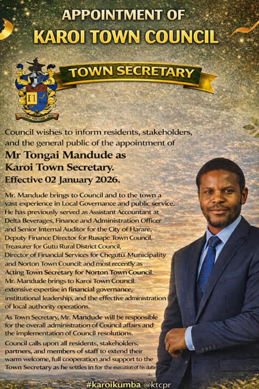 “Mr. Mandude brings to Karoi Town Council. extensive expertise in financial governance, institutional leadership, and the effective administration of local authority operations.